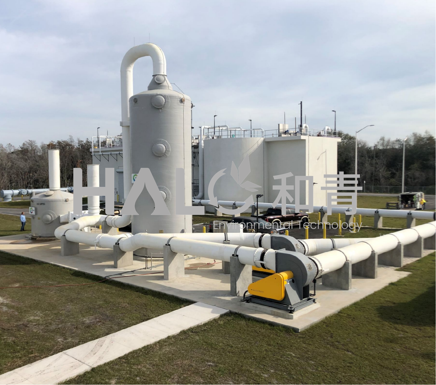臭气经收集管道进入洗涤塔,气体在塔内由下向上运动,喷淋水由循环泵提升进入塔内,通过螺旋喷头由上至下喷出,在塔内形成一道水幕。进入塔内气体经布气层首先接触塔内水幕,予以加湿、降尘、溶解。喷淋塔配以不同型号与配方的植物液为酸、碱中和液,能安全有效地去除以硫化氢、硫醇类、氨、含氮类有机物为主的异味。两个塔的有机结合可以去除不同浓度和峰值水平的臭气,以确保稳定符合要求的去除异味使处理后的废气达标排放。洗涤塔内的中段有一层填料层,比表面积大,增大气液接触面积,使从填充层下部向上流动的臭气经由填料空隙与向下喷淋的雾状植物液充分接触反应,从而将臭气分子充分溶解、吸收和反应掉。